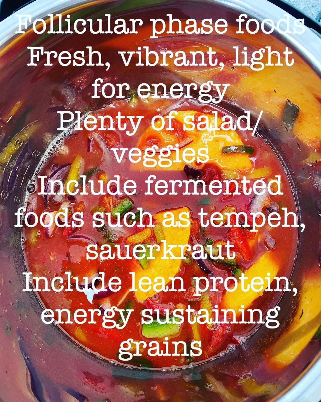 During the follicular phase light fresh, colourful foods, lean protein, and energy sustaining grains can all help with energy levels and hormone regulation. Including some fermented foods such as tempeh and sauerkraut can be beneficial for gut health and contribute to regulation of oestrogen levels in the body. Follicular phase can be a good time to try new things, so new recipes, activities, and